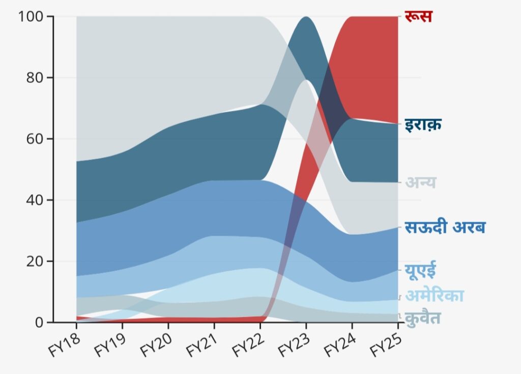 वित्त वर्ष 2024-2025 तक भारत के कच्चे तेल के आयात में रूस की हिस्सेदारी 35 प्रतिशत तक पहुँच गई।
